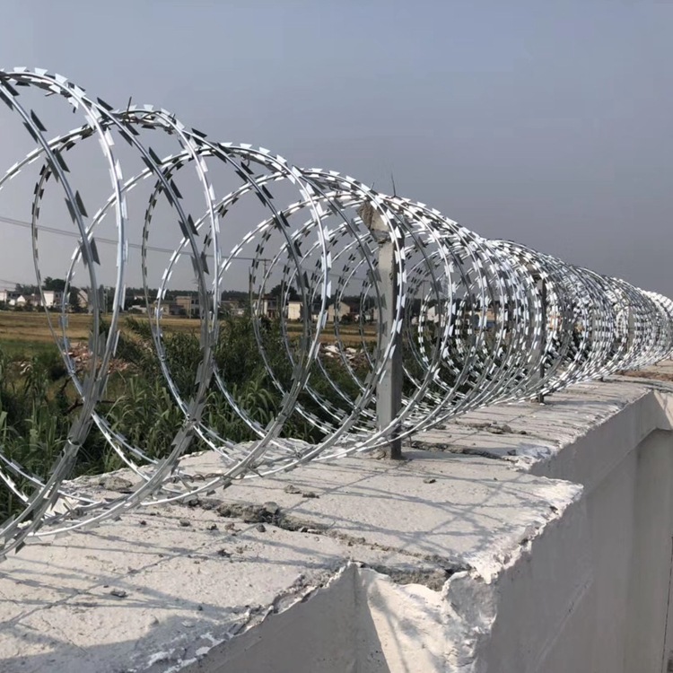 刺絲滾籠的上鋅量是有特殊要求的,現(xiàn)在市面上銷售的基本上都是每平米40-50克的上鋅量的普通產(chǎn)品,高鐵上面應(yīng)用的話一般環(huán)境選用的是120克上鋅量,特殊環(huán)境選用的是250克甚至是270克以上的產(chǎn)品,無論是板材還是里面包裹的內(nèi)絲都必須保證這個(gè)上鋅量--星宇刺繩廠15075898878。 (1)、刺絲滾籠采用刀片刺繩繞圈后相臨兩圈每隔120°用刺絲連接卡固定,張開后形成蛇腹網(wǎng)狀,閉合后刀片刺繩圈徑為50cm,張開后每交叉圈安裝間距20cm,直徑不小于45cm。(2)、刀片刺繩由沖切鋼板采用機(jī)械壓軋?jiān)阡摻z上成型,刀刺寬度22mm,兩刃垂直間距15mm,刀刺縱向間距34mm,芯絲直徑為2.5mm。刀片采用厚度0.5mm的Q195鋼板沖切制作,芯絲由HPB300?6.5mm高線鋼絲加工。(3)、刺絲滾籠由刺絲連接卡扣與固定在支架上的縱向拉筋相連接,縱向拉筋與支架的連接采用?2.5mm的冷拔鍍鋅鋼絲繞2圈后擰緊固定,支架設(shè)置在跨度3m防護(hù)柵欄的立柱和跨中位置,其他跨度僅設(shè)置與立柱上部,支架與防護(hù)柵欄采用支架抱箍連接。(4)、刺絲滾籠的下緣距離鋼筋混凝土防護(hù)柵欄上緣的垂直距離為0.05m。