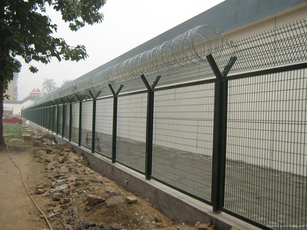 監(jiān)獄網(wǎng)墻設(shè)計(jì)要求:整體固定連貫一致,標(biāo)準(zhǔn)生產(chǎn)質(zhì)量,框網(wǎng)方正,對(duì)角線誤差不大于2cm。監(jiān)獄隔離網(wǎng)網(wǎng)面安裝離地距離5-8cm,框網(wǎng)與立柱采用螺栓固定邊耳式連接網(wǎng)頁每邊與立柱連接點(diǎn)不少于六處。立柱采用水泥澆灌預(yù)埋式,規(guī)格為600*600*600mm (長*寬*深),底座四角預(yù)制四個(gè)直徑25mm熱鍍鋅螺栓(每個(gè)螺栓中心為距基礎(chǔ)兩邊150mm的交叉點(diǎn)),從頂端往下絲長不小于150mm (與地籠焊為一體),螺栓高于底座平面50mm (底座平面應(yīng)與所在位置最終地面高度在同一水平高度),螺栓間距為300mm*300mm,與立柱法蘭盤螺孔相適應(yīng)。立柱保持豎直、不歪斜。立柱做調(diào)直處理,每20米校正,每100米偏差角度不大于5°,安裝整體無歪斜,隔離網(wǎng)整體呈直線(除地形需要做出適宜角度外)。