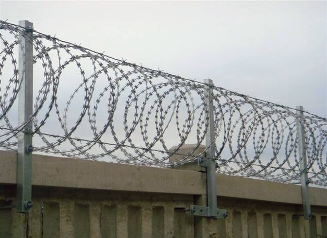 鐵路防爬刺又稱鐵路刺絲滾籠,安裝由土字支架、一字加密支架、抱箍組成,鐵路刀刺網(wǎng)支架-刺絲滾籠 土字支架 定做角鋼折彎柱,鐵路刺絲滾籠新建鐵路時速200公里以上,采用2.2米高度鋼筋混凝土防護柵欄+0.5米刺絲滾籠,設計時速200公里以下鐵路,一般地段采用1.8米高度鋼筋混凝土防護柵欄+0.5米刺絲滾籠,刺絲滾籠采用刀片刺繩繞圈后相鄰兩圈每隔120°用鐵絲連接卡固定,張開后形成蛇腹網(wǎng)狀,閉合后刀片刺繩圈徑為50cm,張開后每交叉圈安裝間距20cm,直徑不小于45cm,刺絲滾籠下緣距離鋼筋混凝土防護柵欄上緣的垂直距離為0.05米。