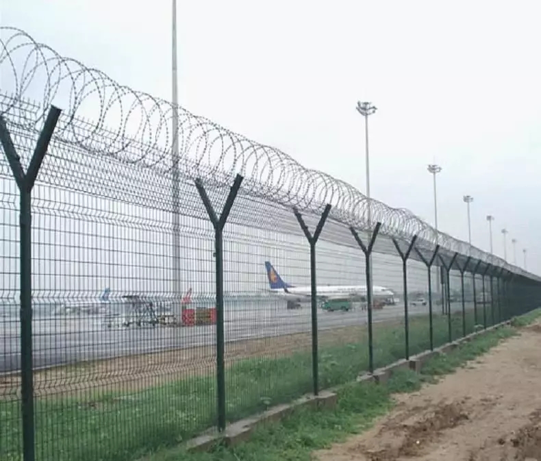 飛機場隔離網或機場圍欄,是保護機場邊界安全,讓飛機起飛更加順利的重要措施,因其由V型支架立柱、加強型焊接片網、安全防盜連接件和熱鍍鋅刀片刺籠組成可以有效防止行人攀爬跨越,可以提高安全防御,被應用在飛機場上。