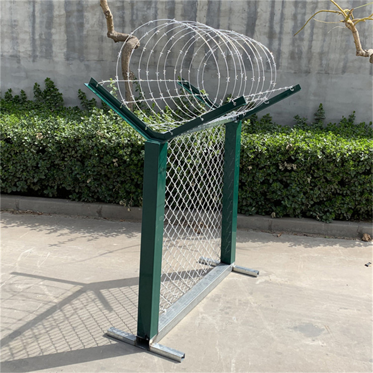 鋁包鋼刺絲滾籠是使用一種新型原材料鋁包鋼絲制作而成的機場圍界網(wǎng)產(chǎn)品,鋁包鋼絲是將鋼絲芯線外層包裹一層鋁作為外層防腐材料,它比傳統(tǒng)的PE或者PVC包塑鋼絲防腐性能更強,通常可以延長機場圍界產(chǎn)品使用壽命10-15年以上,適合于沿??諝鉂駶櫢g性強的地區(qū)和環(huán)境較惡劣的沙漠邊緣地帶。鋁包鋼絲機場圍界網(wǎng)孔一般為50*50mm,絲徑5mm,頂部可搭配有V字叉和刀刺滾籠以加強防護(hù)能力。它還有一個優(yōu)點就是鋁層是與鋼絲一起經(jīng)機械拉拔到一起的,不易脫落。