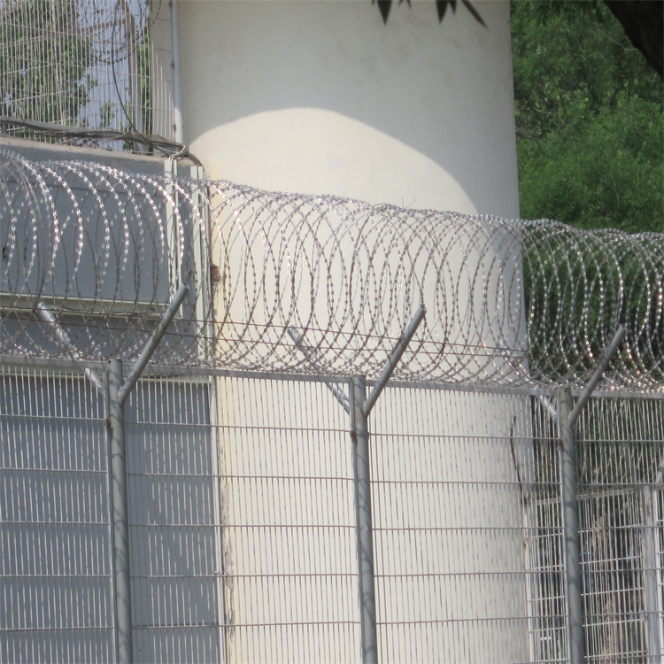 片厚度0.5mm。蛇腹形刀刺網(wǎng)的排列密度不小于 16圈/米,相鄰每圈間距不大于120mm。監(jiān)獄用的刀刺網(wǎng)通??壑g的距離是