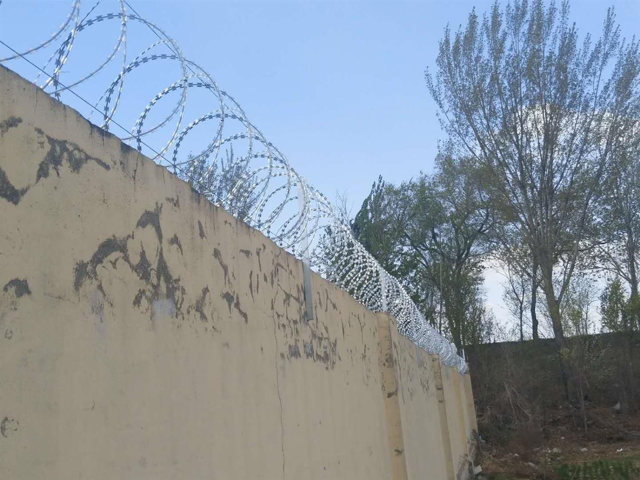 4、在刀片刺網(wǎng)的Y字型支架的兩邊各拉一根鋼絲,對(duì)刺網(wǎng)進(jìn)行再固定,以免左搖右晃。