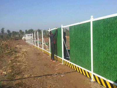 圍擋基腳采用M10水泥砂漿砌筑MU10頁巖磚磚砌0.5*0.5的基礎(chǔ),用于增強(qiáng)圍擋抗風(fēng)穩(wěn)定性;pvc圍擋設(shè)2.5米高,寬3米為一板。施工圍擋做美化處理,噴涂企業(yè)名稱、安全、質(zhì)量、文明施工用語及開發(fā)項目商業(yè)廣告,嚴(yán)禁張貼、涂寫垃圾廣告。