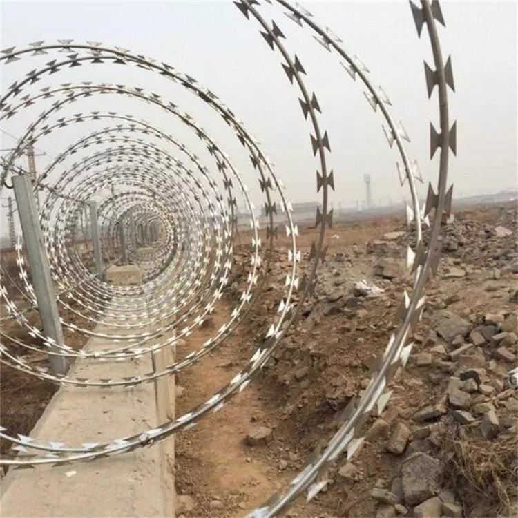 刺絲滾籠產(chǎn)品應(yīng)用:鐵路柵欄一改往日焊接鋼絲網(wǎng)柵欄、刺絲網(wǎng)柵欄等產(chǎn)品,改為防御性更強(qiáng)、壽命更長久的:鋼筋混凝土柵欄+0.5米高刺絲滾籠的防護(hù)柵欄。
