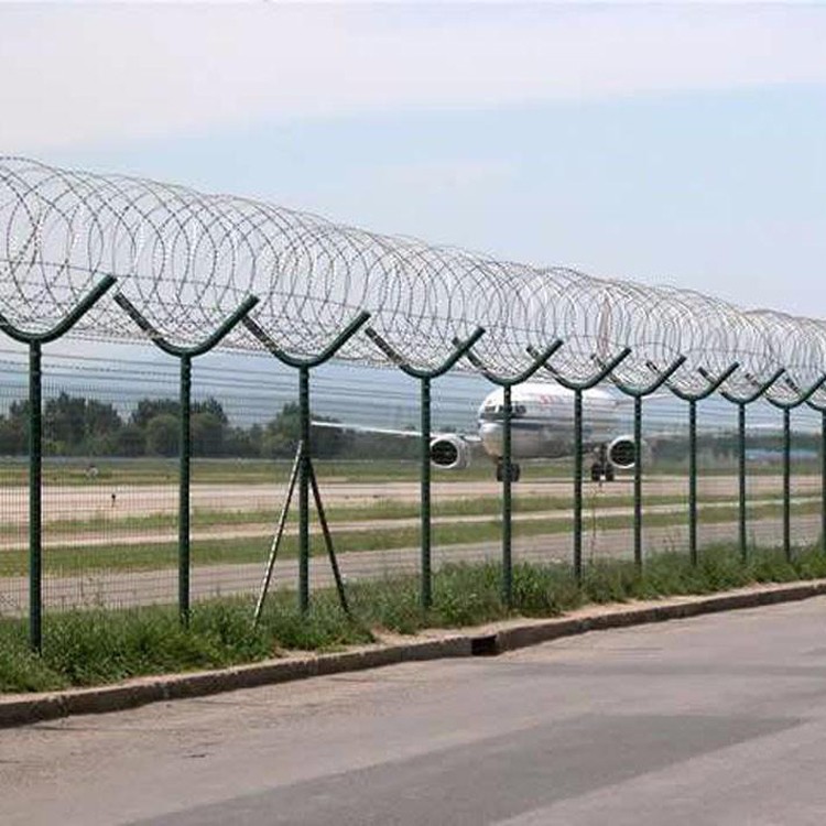 機(jī)場(chǎng)護(hù)欄網(wǎng)又稱作“Y型安全防御護(hù)網(wǎng)”,是由V型支架立柱加強(qiáng)型焊接片網(wǎng),安全防盜連接件和熱鍍鋅刀片刺網(wǎng)組成強(qiáng)度和安全防御性級(jí)別很高。被廣泛應(yīng)用在機(jī)場(chǎng),基地等高安全場(chǎng)所。