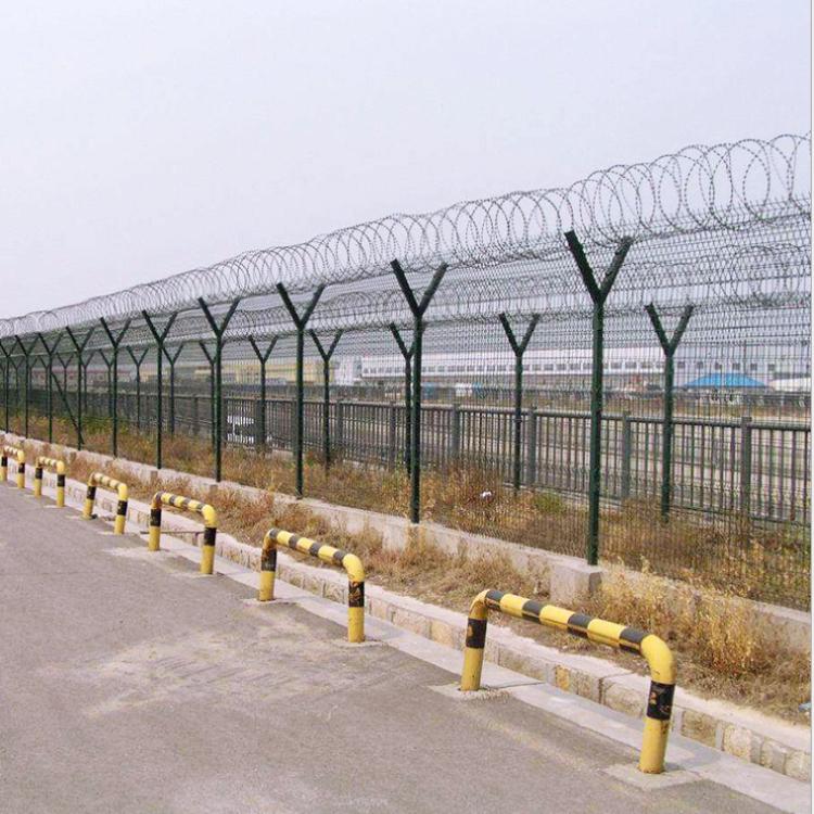 機(jī)場圍界Y型立柱安裝V型圍網(wǎng)加裝蛇腹型刀刺滾籠,會在機(jī)場外圍形成難以逾越的屏障,保障了機(jī)場各機(jī)組人員的安全。鋼筋網(wǎng)圍界安裝簡便,施工簡單,高阻隔,防攀爬成為機(jī)場飛行區(qū)圍界的必備之選。
