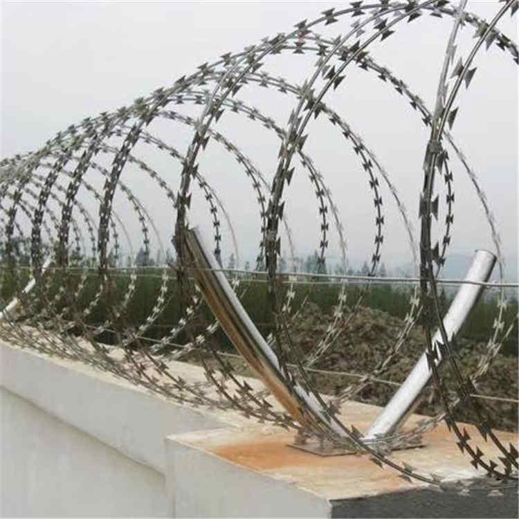 第二種,在安裝的過(guò)程,可根據(jù)圍墻的長(zhǎng)度設(shè)計(jì)需要使用多少根Y字支架,一般以5-10cm的間距為好,把Y字型支架固定在圍墻上面,其中Y字形支架可根據(jù)您的實(shí)際情況進(jìn)行打孔,以此為了安裝刀刺網(wǎng)的時(shí)候起到固定的作用。然后刀刺網(wǎng)的Y字支架上兩邊各拉一根鋼絲,對(duì)刀刺網(wǎng)加以固定,以免左右搖晃。