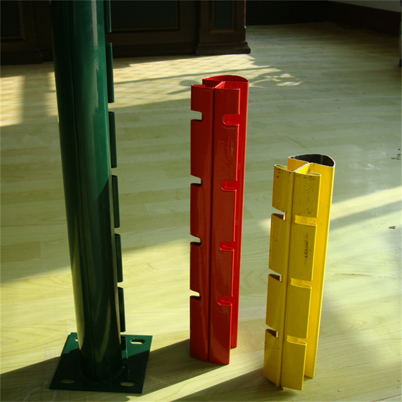 桃型柱護(hù)欄網(wǎng)一般采用桃型立柱與折彎網(wǎng)片(兩道折彎、三道折彎或四道折彎、折彎處加加強(qiáng)筋)搭配、所以又稱為折彎護(hù)欄網(wǎng)。桃型柱是通過(guò)機(jī)器冷壓、冷彎成型。柱體外側(cè)為橢圓型,內(nèi)側(cè)兩板相接后均各自向外彎制成U型,即為掛鉤部分。為便于桃型立柱與網(wǎng)片的連接,立柱內(nèi)側(cè)根據(jù)網(wǎng)片的網(wǎng)孔尺寸,延立柱長(zhǎng)度方向均勻的設(shè)置N組鉤掛缺口分布于柱體兩側(cè),掛鉤U型的外部與外側(cè)的橢圓形柱體的直邊相切,有效地防止被撬開(kāi),保證了護(hù)欄的防撬安全性能。