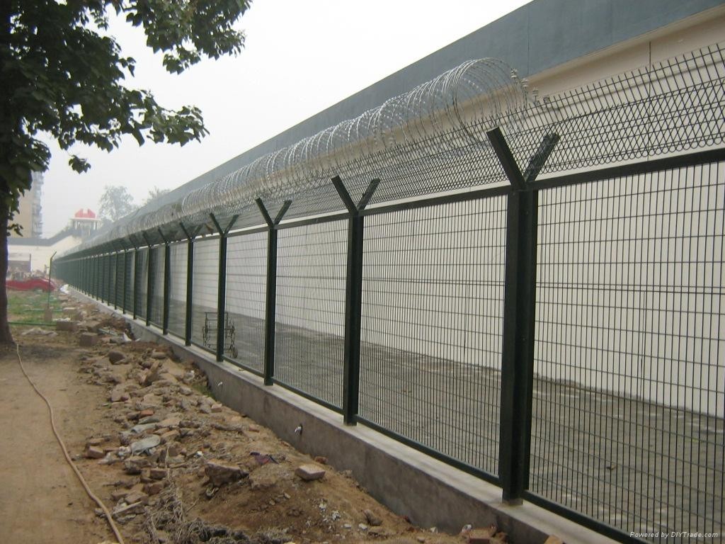 監(jiān)獄護(hù)欄網(wǎng)又稱作“Y型安全防御護(hù)網(wǎng)”,是由V型支架立柱,加強(qiáng)型焊接片網(wǎng),安全防盜連接件和熱鍍鋅刀片刺籠組成強(qiáng)度和安全防御性級(jí)別很高。近年來,被廣泛應(yīng)用在監(jiān)獄,軍事基地等高安全場(chǎng)所。注:如果在監(jiān)獄護(hù)欄網(wǎng)頂部加裝刀片刺絲、刀片刺繩后又很好的增強(qiáng)了安全防護(hù)性能。采用電鍍、熱鍍、噴塑、浸塑等防腐形式,具有很好的抗老化、抗曬、耐候等特點(diǎn)。其產(chǎn)品造型美觀、花色多樣,既起到圍欄作用,又起到美化作用。由于具有安全性高、防攀爬能力好,網(wǎng)片連接方式采用特制SBS緊扣件,有效防止人為的破壞性拆卸,橫向四道折彎加強(qiáng)筋,使網(wǎng)面強(qiáng)度顯著增加。