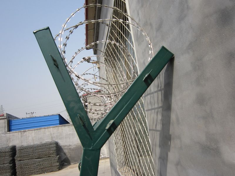 機場Y型圍界網(wǎng)頂部的刺絲滾籠多采用熱鍍鋅,Φ500mm圈徑的刀刺網(wǎng)。材料上各個廠家都會采用熱鍍鋅,上鋅量一般會有差距,當然價格也會不同