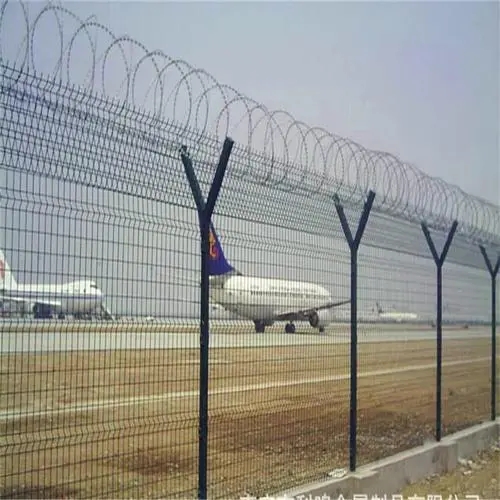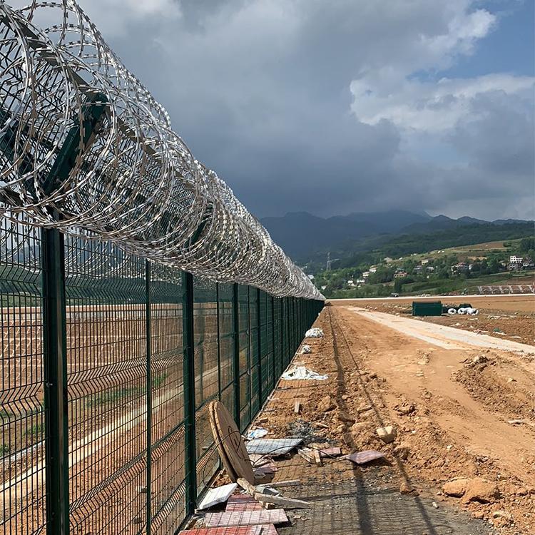 機(jī)場(chǎng)圍界常用規(guī)格: 尺寸:2*3m(柱中到柱中) 網(wǎng)孔:5*10cm,5*20cm 立柱一般采用60X60、80X80的矩形鋼管,頂部帶有v字支架用來(lái)安放刀刺滾籠。 優(yōu)點(diǎn):相較于傳統(tǒng)鋼筋混凝土墻來(lái)說(shuō),具有成本低易安裝施工,施工周期短等特點(diǎn)。