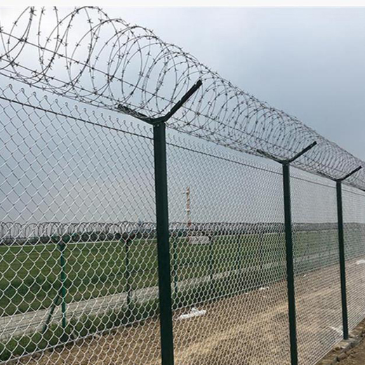 機(jī)場圍界是由Y型立柱、加強(qiáng)型焊接網(wǎng)片、安全防盜連接件和熱鍍鋅刀刺滾籠組成安全防御性級別很高的隔離網(wǎng)產(chǎn)品。機(jī)場圍界表面采用電鍍、熱鍍、噴塑或浸塑等防腐形式,具有良好的抗腐蝕、抗曬、抗老化的優(yōu)點。其造型美觀,既安全作用又有美觀作用。被廣泛應(yīng)用在機(jī)場、監(jiān)獄、軍事基地等高安全場所。