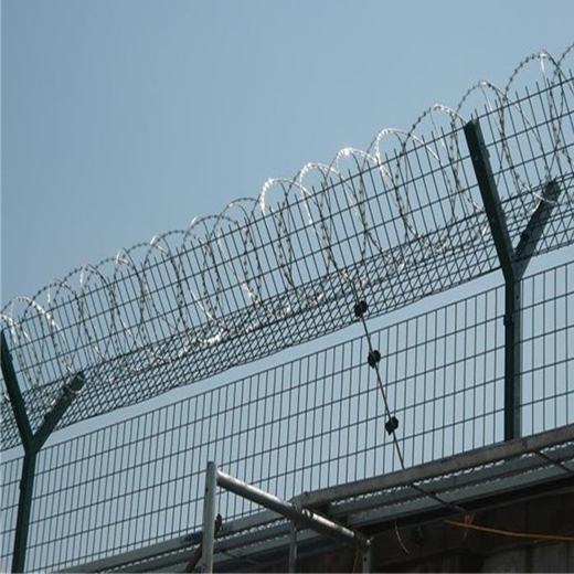 機場圍欄網(wǎng)由安全防盜連接件和熱鍍鋅刀片刺籠組成,是具有高強度和安全防御級別的隔離柵產(chǎn)品。近年來,機場圍欄網(wǎng)已被廠泛應(yīng)用于機場、軍事基地等高安全場所。在機場圍欄網(wǎng)的頂部加裝刀片刺絲、刀片刺繩,可有效增強安全防護性能。原料材質(zhì):采用國標(biāo)Q195低碳鋼冷拔絲、管等。