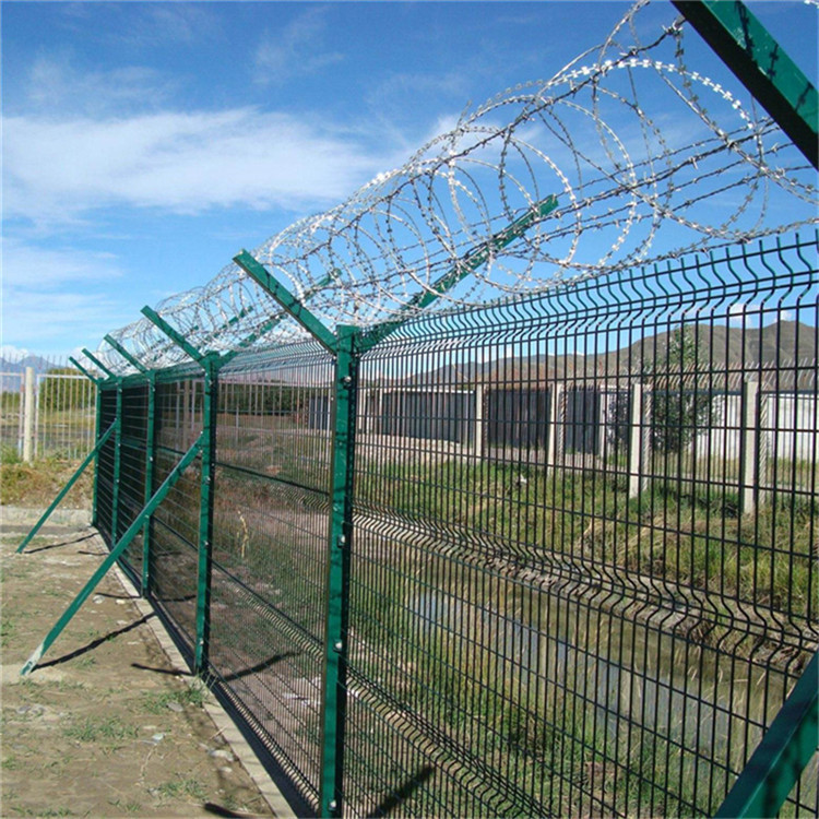 機場圍界網(wǎng)頂部加裝刀片刺絲、刀片刺網(wǎng)后又很好的增強了安全防護性能。其產(chǎn)品造型美觀、花色多樣,既起到圍欄作用,又起到美化作用。由于具有安全性高、防攀爬能力好網(wǎng)片連接方式采用特制SBS緊扣件,有效防止人為的破壞性拆卸,橫向四道折彎加強筋,使網(wǎng)面強度顯著增加。