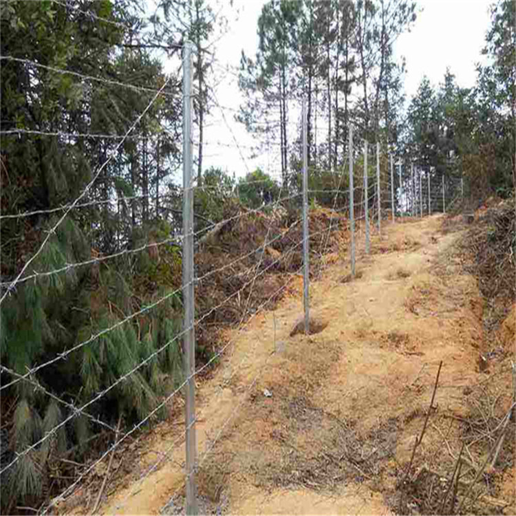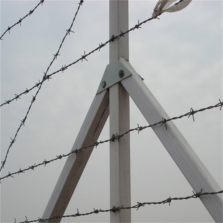 4)刺鋼絲安裝時(shí)要從端頭立柱開(kāi)始,刺鋼絲之間要平行、平直;繃緊后用鋼絲與立柱上的鉤扣綁扎固定,橫向與斜向刺鋼絲相交處也要用鋼絲綁扎。