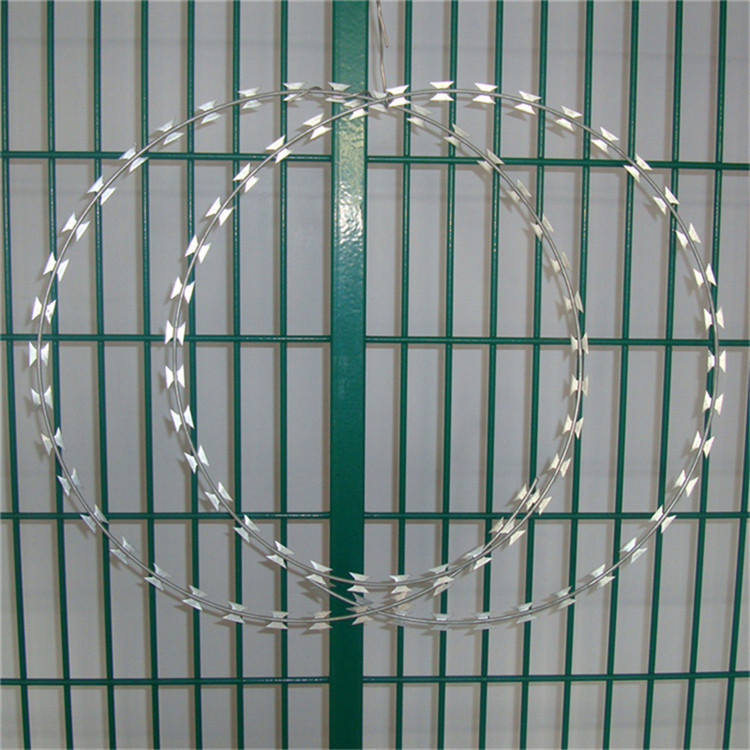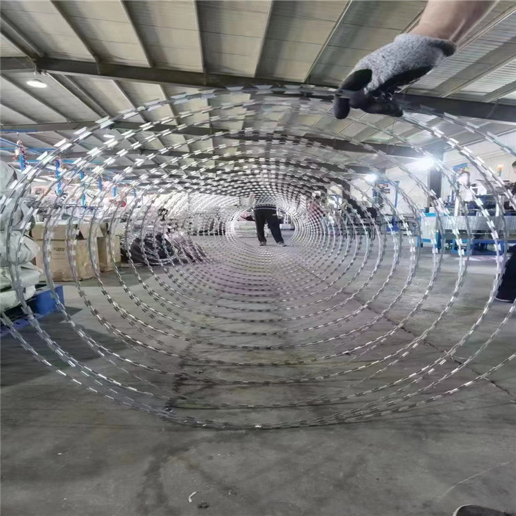 (4)支架在圍墻上的固定方法一般為底盤打膨脹螺絲固定。固定好后,方可進(jìn)行蛇腹形刀刺網(wǎng)安裝。