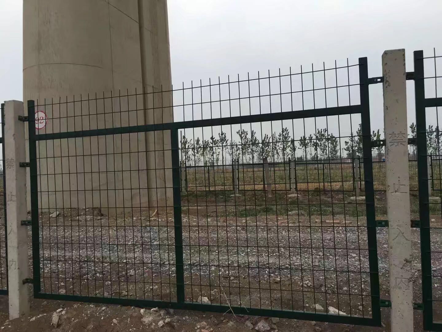 鋼筋混凝土立柱金屬網(wǎng)片防護(hù)柵欄可采用單開門或雙開門兩種形式。單開寬度1.5m,雙開寬度3m,其網(wǎng)片形式與防護(hù)柵欄保持一致,